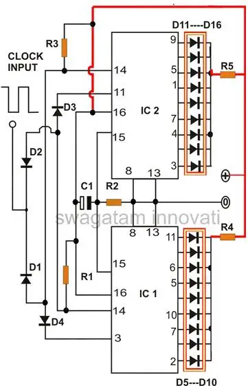 Ic 4017 circuits and projects for hobby electronist and school. If q3 is high, the counter value is 3. Change this pin from low to high to increase the counter. Connect the vdd pin to the positive terminal and the gnd pinto the negative terminal. Most versions of the chip support up to 18v. Leds are connected to each of the outputs and therefore appear to be "running" along a line. First of all, you need a power supply voltage of 3 to 15v. This has to do with the manufacturer of the chip and the technology used. This is a two ways of led running lighting. Schnelle lieferung von gemini produkten. You can use a different color for this. The clock inhibit (ci) pindisables the counter so that any clock pulse on the clk pin is ignored. 555 timer acts as a pulse generator providing an input to the 4017 counter ic.