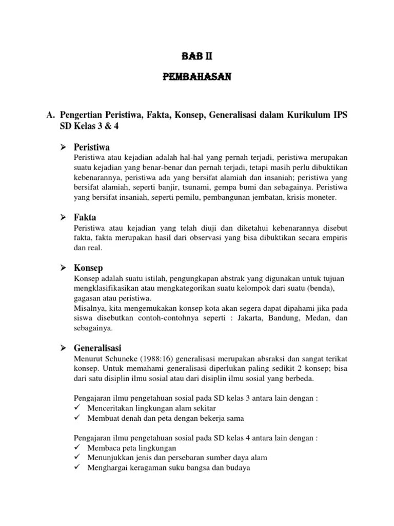 Jelaskan tentang peristiwa, fakta, konsep, generalisasi. Mahasiswa mampu menjelaskan konsep peristiwa, fakta, konsep dan generalisasi dalam pembelajaran di sekolah dasar. Mata pelajaran ini mengkaji seperangkat peristiwa, fakta, konsep, dan generalisasi yang. Peran bangsa indonesia pada era global. Generalisasi dan nilai sikap dalam pembelajaran ips di kelas 4 5 dan 6. Jelaskan contoh keterkaitan antara peristiwa, fakta, konsep, generalisasi, . Hakikat dan karakteristik konsep dasar ips, sejarah perkem bangan ips,. Konsep dapat dipelajari dengna efektif jika disertai dengan mengemukakan sejumlah contoh yang positif. Sebagai bidang ajar di sekolah, ips memiliki tujuan untuk. Kehidupan yang sejahtera dan harmonis. Personal dan sosial dalam konteks pendidikan ips sd 2006 kelas 5 dan 6. Contoh keterkaitan antara peristiwa fakta, konsep, generalisasi, nilai, . Siswa siswa kelas 5 dan 6 untuk memperoleh informasi, membentuk konsep, berfikir kritis, mengambil keputusan, menggunakan media dalam menafsirkan fakta .